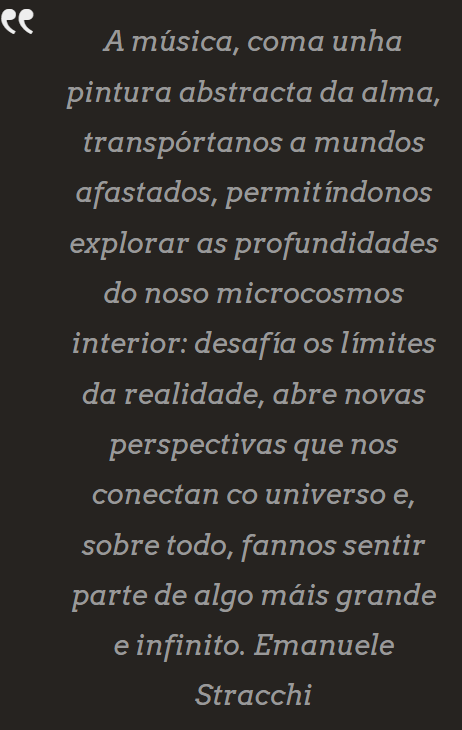 Emanuele Stracchi (Italia, 1990) é un músico versátil: compositor, pianista, director de orquestra e clavecinista. Formado nos conservatorios de Terni e Roma, obtivo titulacións superiores en piano, composición, música aplicada e dirección, ademais de estudos en filosofía. Premiado internacionalmente como intérprete e compositor, actuou en salas como o Carnegie Hall de Nova York e o Concertgebouw de Ámsterdam. As súas obras foron interpretadas en Europa e América, e colaborou con institucións como RAI Radio 3, o Teatro de Roma e o Festival Suoni Controvento. Actualmente compaxina a creación musical coa docencia no Conservatorio “Puccini” de La Spezia.