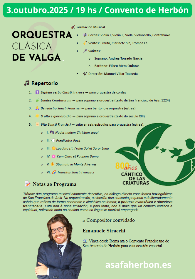O vindeiro 3 de outubro ás 19:00 horas, a Igrexa do Convento de Herbón acollerá un concerto extraordinario para celebrar a clausura do VIII Centenario do “Cántico das Criaturas”, a emblemática obra de San Francisco de Asís que exalta a beleza e irmandade de todo o creado.