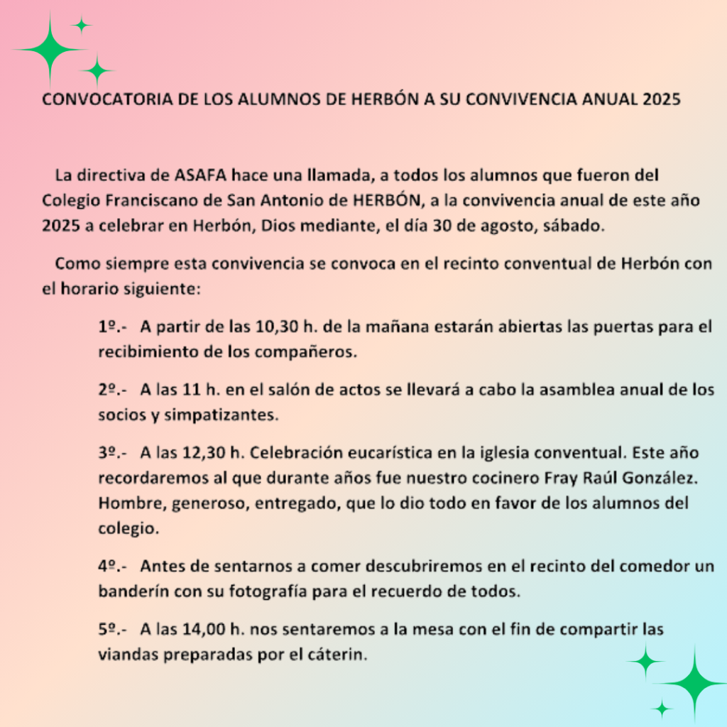 El próximo sábado 30 de agosto, la Asociación Sociocultural Amigos de San Francisco de Asís (ASAFA) convoca a sus miembros al tradicional Encuentro Anual en el marco añorado del Seminario Franciscano de Herbón, Convento de San Antonio. Este evento, que celebra su 22º aniversario, avanza con paso firme hacia el cuarto de siglo desde su inicio en 2002, y solo fue interrumpido en los años afectados por la pandemia. Desde su reanudación en 2022, ha seguido fiel al espíritu de continuidad que le da sentido.